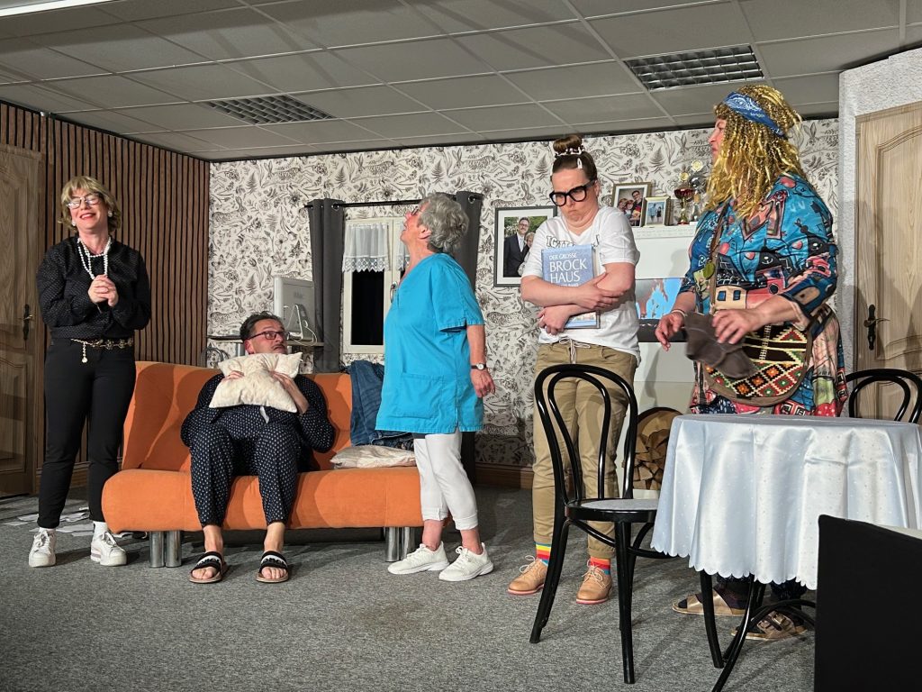 Gerthilde von Meseburg (Melanie Engel) hat für ihren Mann Karl-Heinz (Frank Riga) die Pflegerin Martha Münch (Marlene Lauer) engagiert, die stets ihre Tochter Rita (Jenny Lauer) im Schlepptau hat, während Charlotte von Meseburg (Maria Fliegler) (von links) sich ganz ihrer Esoterik widmet.