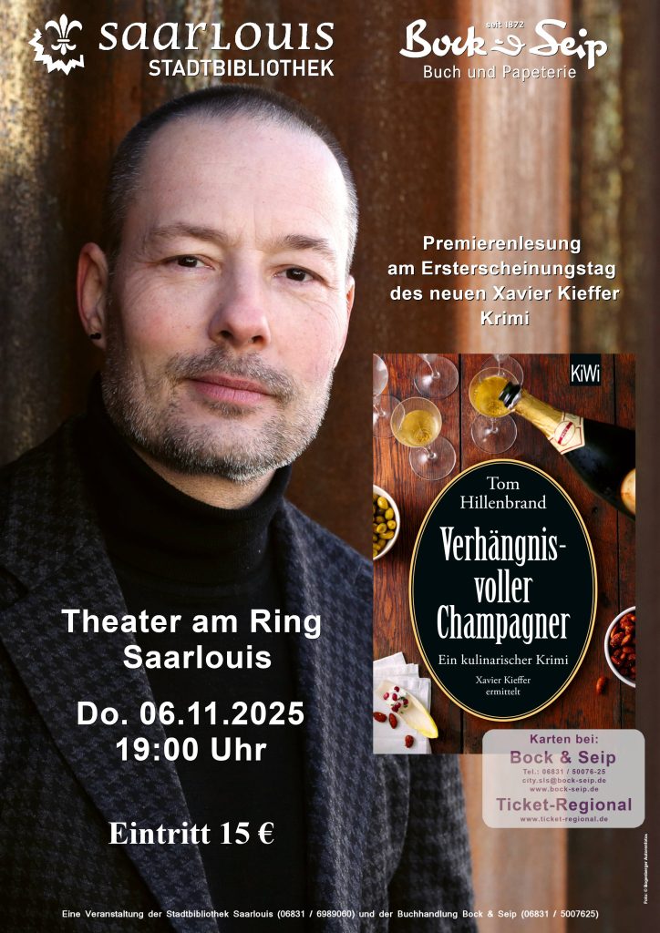 Die Stadtbibliothek Saarlouis und die Buchhandlung Bock & Seip laden zur Premieren-Lesung des neuen Xavier Kieffer Krimi „Verhängnisvoller Champagner“ am Donnerstag, 6. November 2025 um 19 Uhr in das Theater am Ring Saarlouis ein!